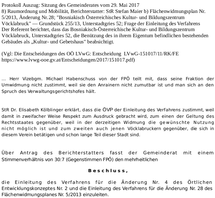 Das Protokoll zu 1. Umwidmungsversuch 17.11.2011 erhielt BiZ erst vom OÖ LVwG nach der Bez. Gericht Verhandlung der Klage des Bürgermeisters. www.nachrichten.at/art71,2540005